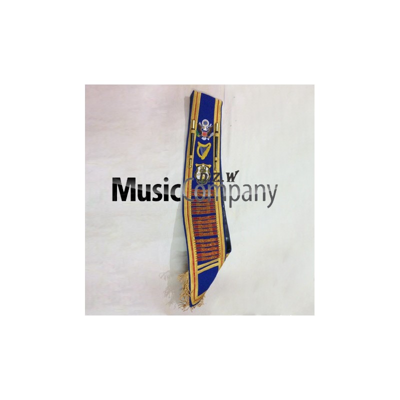 Drum majors baldric sash of the US seal coat hand embroidery crest, Irish harp, pipe band logo and scrolls made in royal blue blazer with gold braid and fringe.