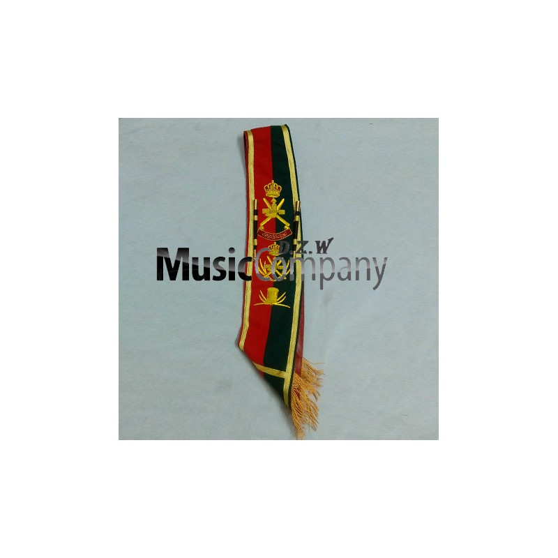 Drum majors baldric sash of the custom hand embroidery crest, badges and crown made in red and green blazer with gold braid and fringe.