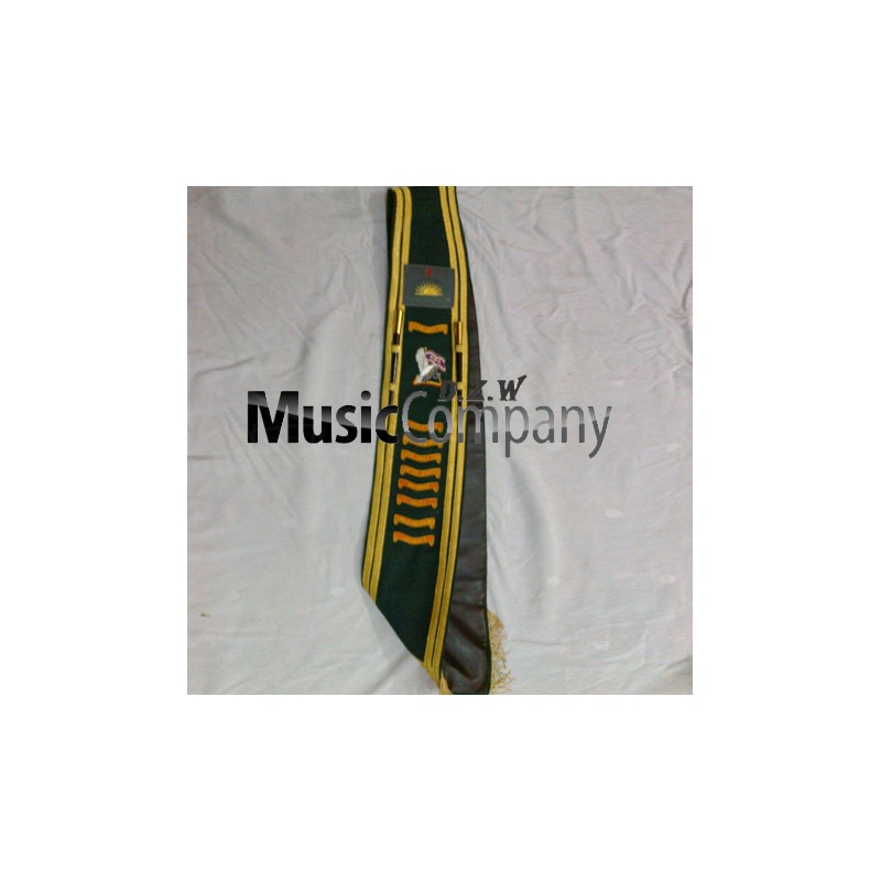 Drum majors baldric sash of the custom hand embroidery crest, badges and scrolls made in green blazer with gold braid and fringe.