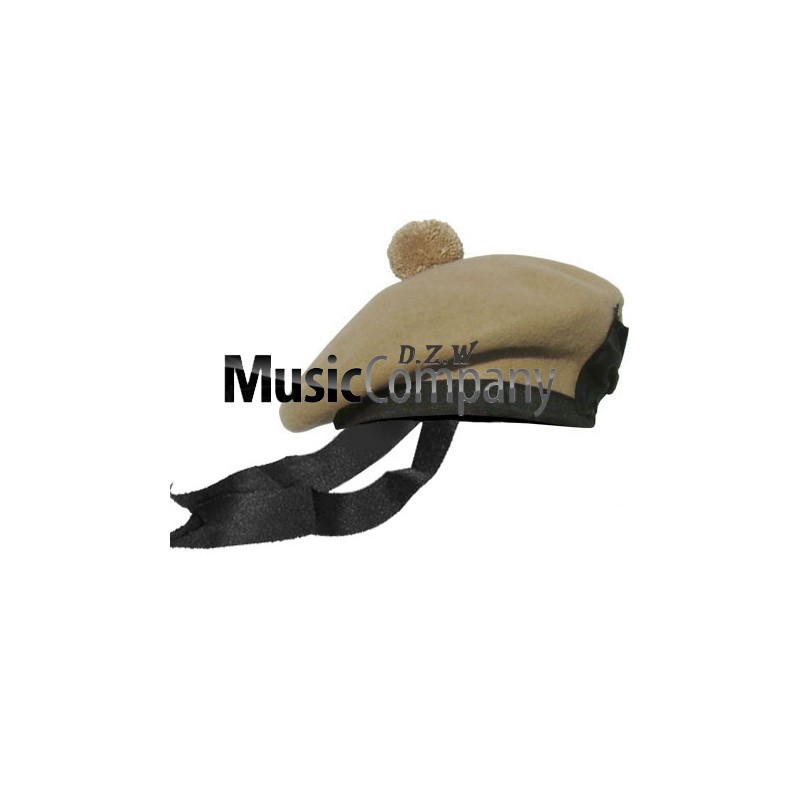 Desert Tan 100% blazer wool body balmoral hat with hand made wool desert tan ball or pom pom. Black silk lining and trim, black silk 1 1/4 inch x 11 inch tail ribbons