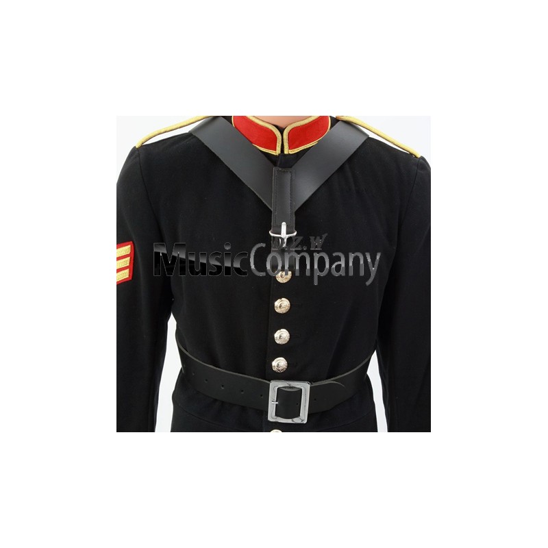 The ‘V’ style, standard bass drum sling goes over the shoulders (V is worn at the front chest/neck area), crosses over at the back and then fastens like a belt at the front of the body (around the stomach area)