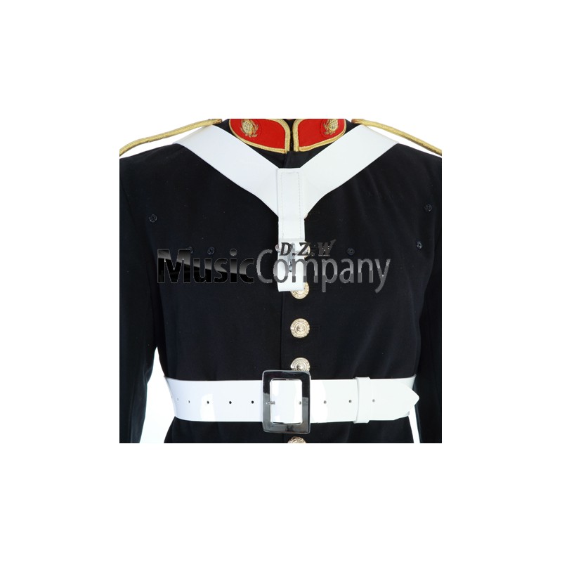 The ‘V’ style, standard bass drum sling goes over the shoulders (V is worn at the front chest/neck area), crosses over at the back and then fastens like a belt at the front of the body (around the stomach area)