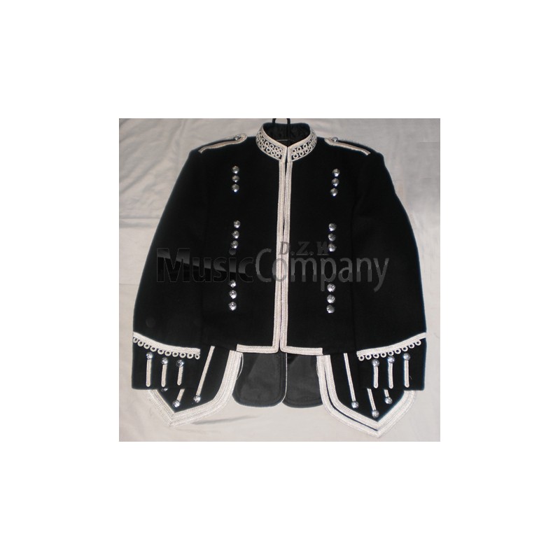 Military style piper drummer pipe band doublet tunic jacket made by 100% wool silver braid 18 nickle plated buttons on front quality zip for close total 40 nickle plated buttons on doublet silver trim on collar and cuff with shoulder shell.