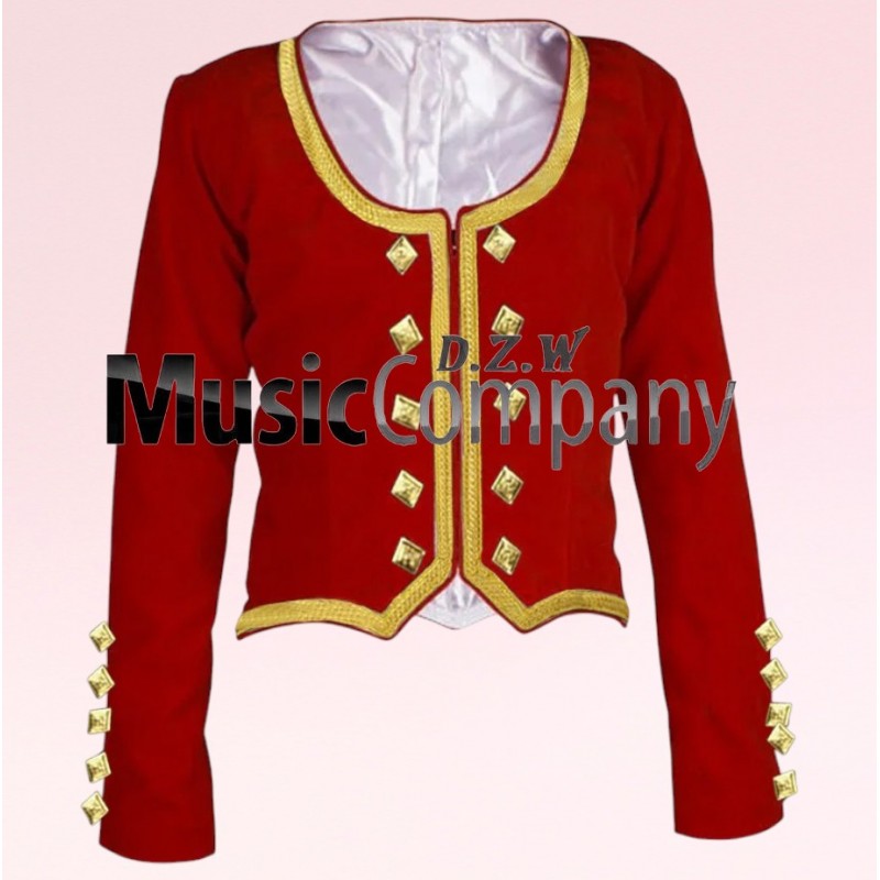Maroon velvet highland jacket, white satin lining, zipper front closure, 10 chrome or gold removable diamond thistle buttons on front affixed with washer and ring clip solver or gold 1/2" braid edge trim...