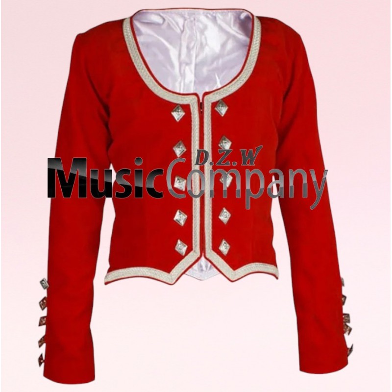 Red velvet highland jacket, white satin lining, zipper front closure, 10 chrome or gold removable diamond thistle buttons on front affixed with washer and ring clip solver or gold 1/2" braid edge trim...