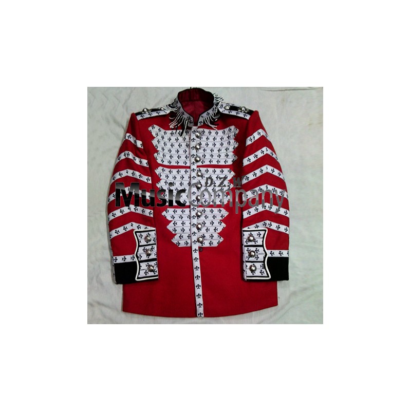Red caremonial irish guards drummer tunic made melton wool body 9 irish guards nickle plated button on front dark navy blue collar, cuff and shoulder.