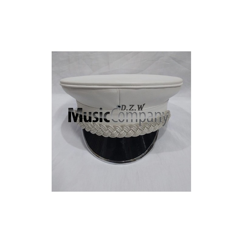 Marching band peak hat made by high quality fabric nice product use in marching band people with white band and silver cord.