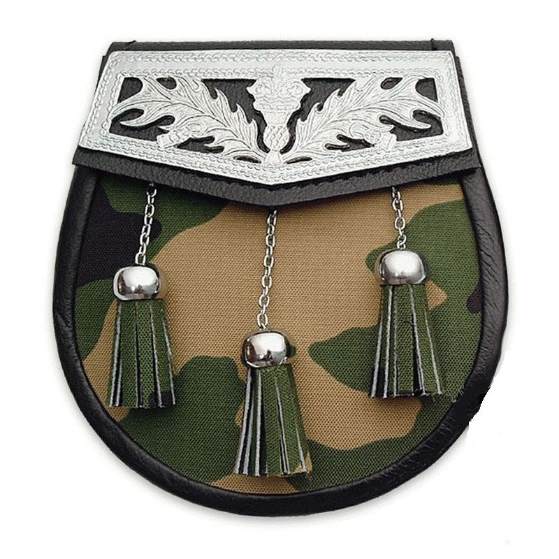 Semi dress black 100% leather sporran, military cloth on front three chain and tassels with thistle cantle and chain belt strip...