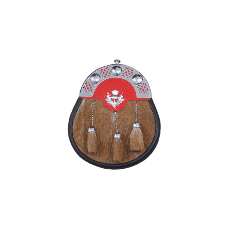 Semi dress black leather sporran made in pure 100% leather sporran, brown fur on front, three nickel plated chain and fur tassels with nickel plated celtic cantle, nickel plated thistle badge, nickel plated chain and hardware buckle, leather strip belt.