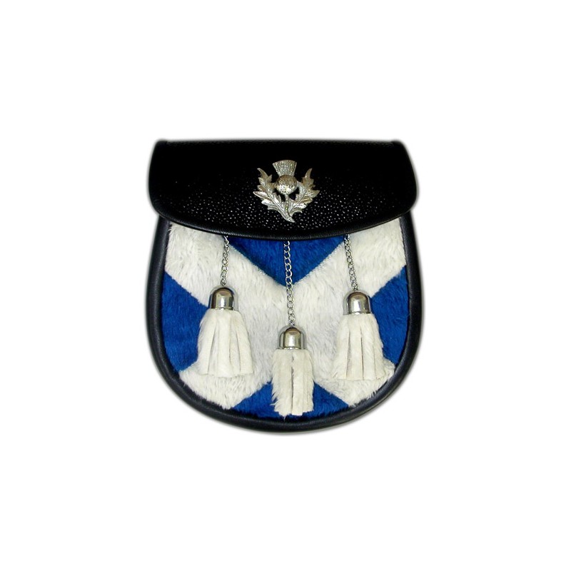 Semi dress black 100% leather sporran, scottish style fur on front three chain tassels with thistle badge chain belt strip...