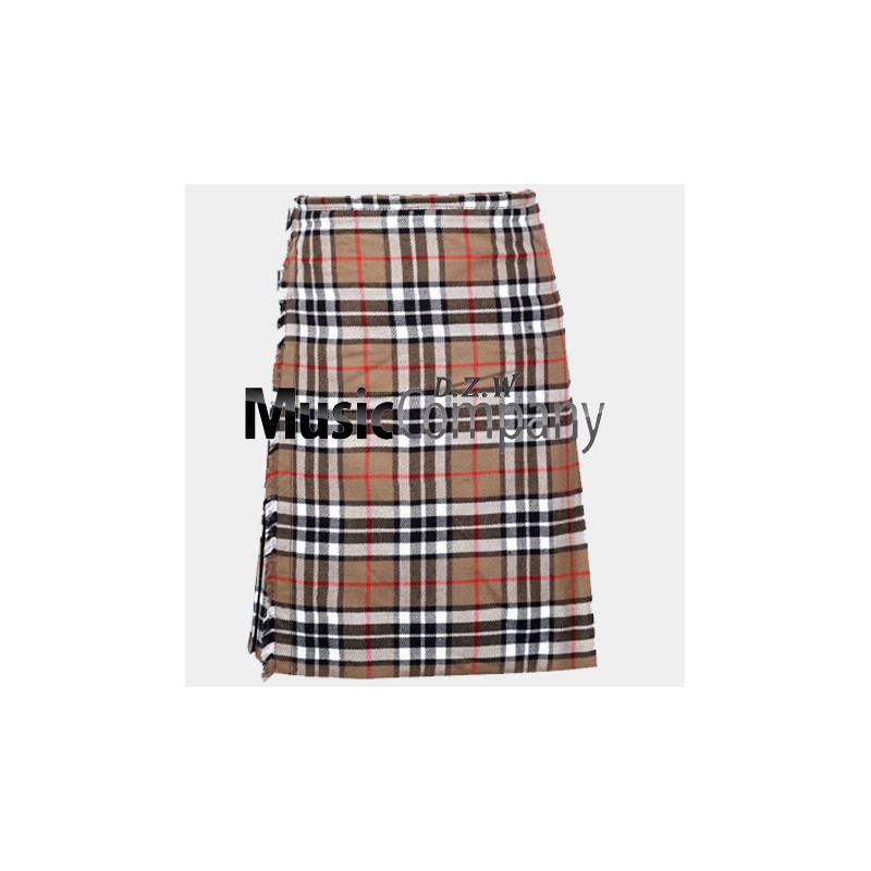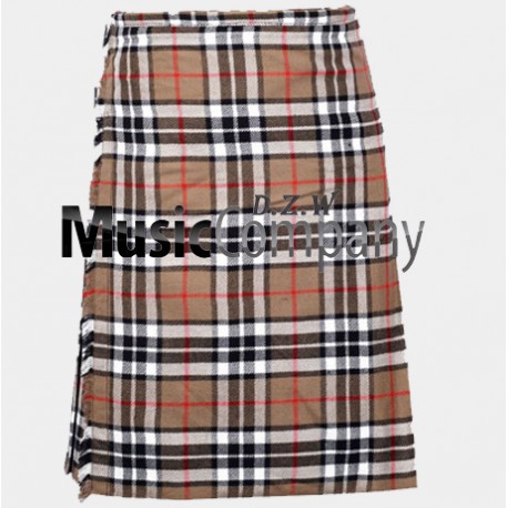Camel Thompson Tartan Kilt with fringe on the right hand side to give an authentic finish of the Scottish traditional kilt. It has straps which fasten at the side and can be adjusted by around 3"-4". It also has belt loops sewn on the back to keep a Tartan kilt belt in place. This Scottish kilt has been designed so that you can wear it in any situation...